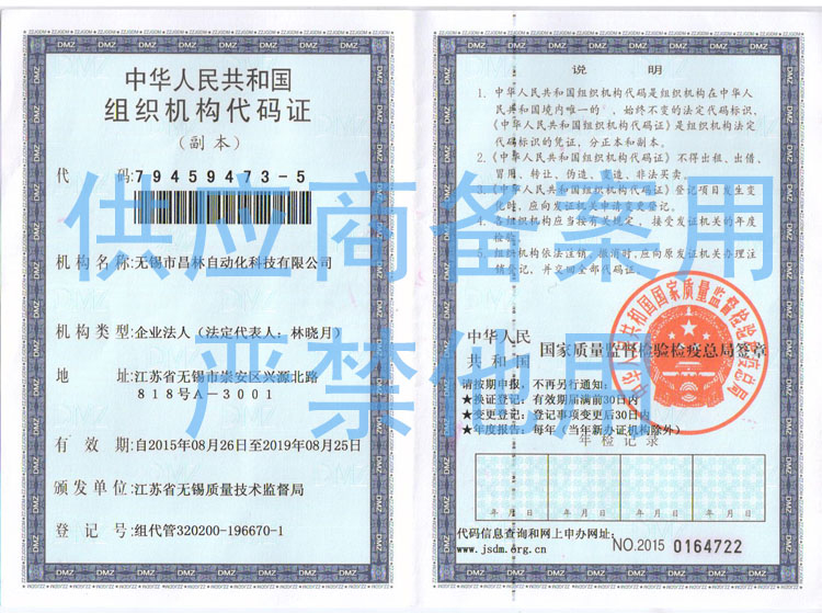 無錫市昌林自動(dòng)化科技有限公司組織機(jī)構(gòu)代碼證