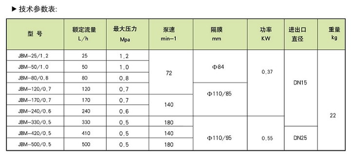 詳細(xì)信息 JBM-25/1.2,JBM-50/1.0,JBM-80/0.8,JBM-120/0.7,JBM-170/0.7,JBM-240/0.6,機(jī)械隔膜式計(jì)量泵 JBM-330/0.5,JBM-420/0.5,JBM-500/0.5,