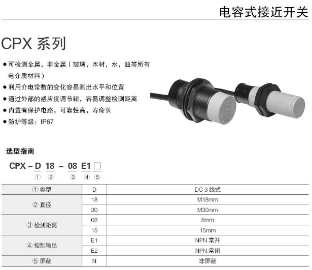 您當(dāng)前的位置:首頁 » 產(chǎn)品&解決方案 » CPX-D18-08E1N,CPX-D30-15E1N,CPX-D18-08E2N,CPX-D30-15E2N,Koino電容式接近開關(guān)