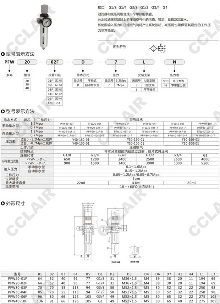 PFW40-01F,PFW40-02F,PFW40-03F,PFW40-04F,PFW40-06F,PFW40-10F,氣動過濾減壓閥