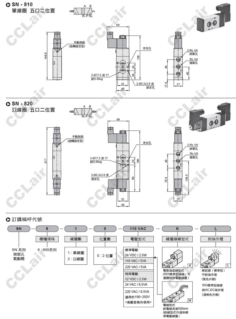 氣立可(chelic),SN-810-24VDC-K,SN-820-110VAC-K,SN-810-220VAC-W,SN-820-12VDC-W |
