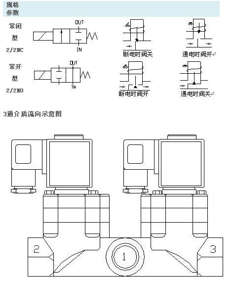2:當(dāng)電磁閥線圈斷電時,1與2關(guān)閉,1通向3。