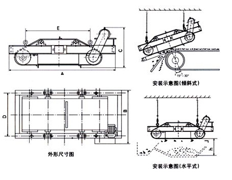 | 型號 | 適應(yīng)帶寬mm | 額定吊高mm | 磁場強(qiáng)度≥MT | 物料厚度≤mm | 勵磁功率≤KW | 驅(qū)動功率≤KW | 適應(yīng)帶速≤m/s | 重量Kg | 外型尺寸mm | ||||