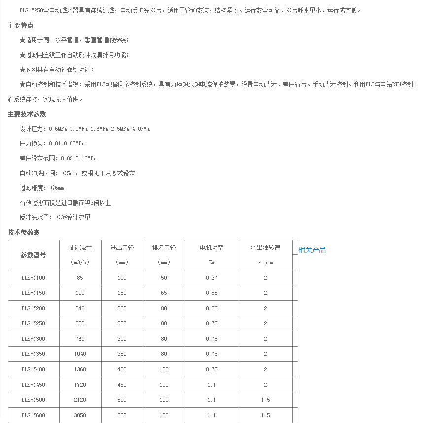DLS-Y100,DLS-Y150,DLS-Y200,DLS-Y250,DLS-Y300,DLS-Y350,DLS-Y400,DLS-Y450,DLS-Y500,DLS-Y600,自清洗全自動濾水器