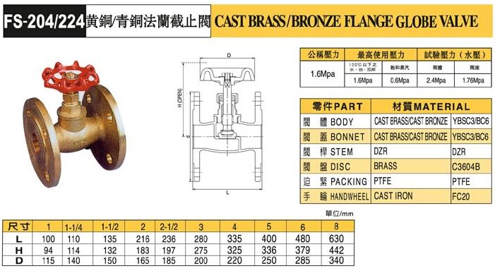 詳細(xì)信息 FS-204,FS-224,黃銅法蘭截止閥 黃銅法蘭截止閥說明: 黃銅/青銅法蘭截止閥結(jié)構(gòu)合理,性能優(yōu)良,造型美觀,適用的壓力范圍廣,主要用來接通或截?cái)喙苈分械慕橘|(zhì),具有耐磨、耐高溫,抗擦傷性能好、使用壽命長等優(yōu)點(diǎn)。 公稱壓力:1.6MPa