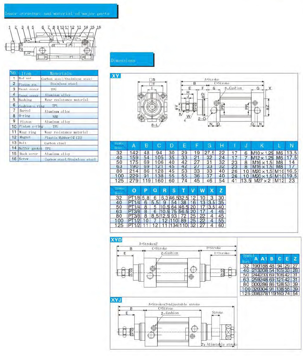 XY-32,XY-40,XY-50,XY-63,XY-80,XY-125,XYD-32,XYD-40,XYD-50,XYJ-63,XYJ-80,XYJ-100,Shinya氣缸