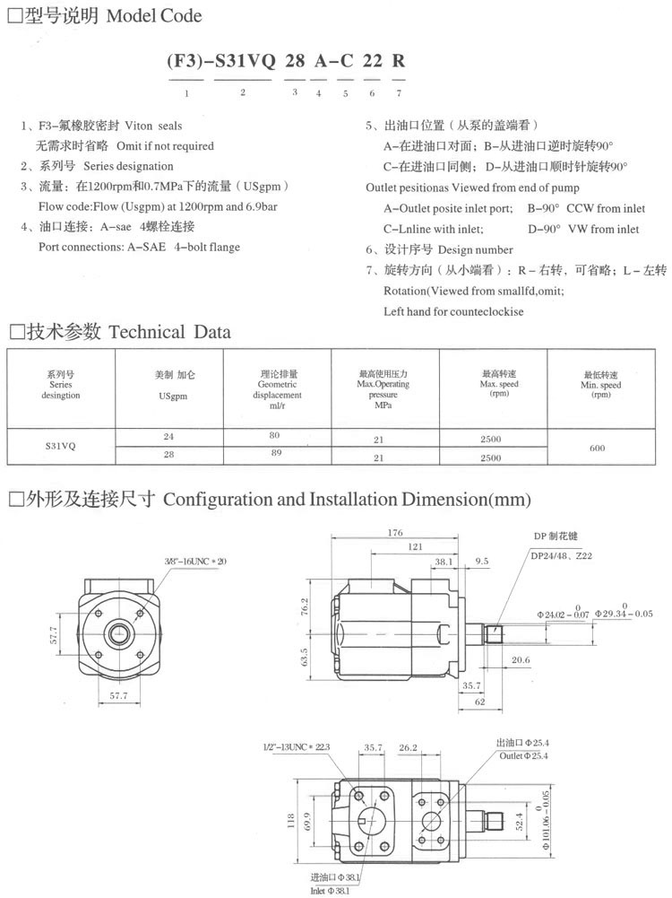 詳細信息 S31VQ28A-C22R,S31VQ28A-A22R,S31VQ24A-B22L,S31VQ24A-D22L,葉片泵