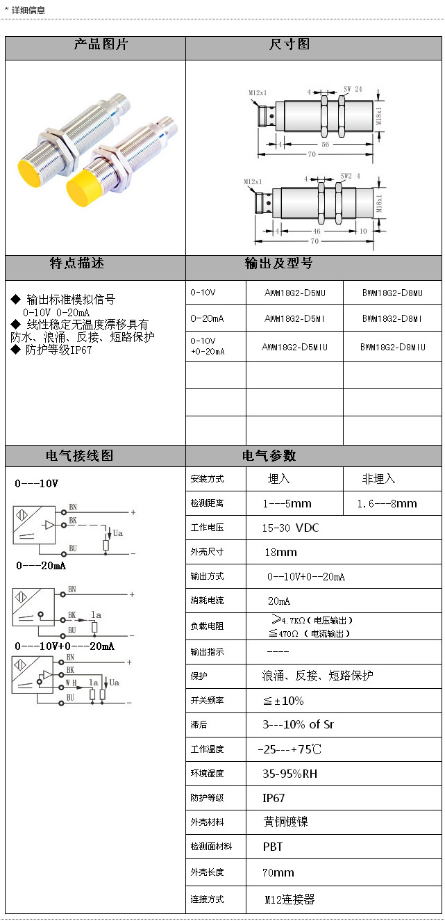 詳細(xì)信息 AWM18G2-D5MU,BWM18G2-D8MU,AWM18G2-D5MI,AWM18G2-D5MIU,BWM18G2-D8MIU,接插式M18模擬量傳感器