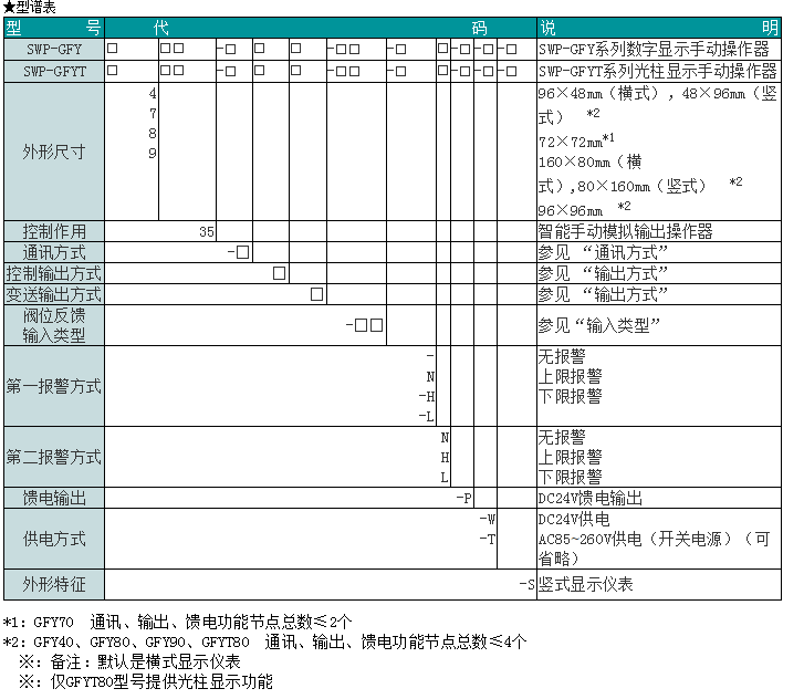 SWP-GFY系列數(shù)字/光柱顯示手動(dòng)模擬輸出操作器可通過(guò)按鍵操作,直接輸出0-10mA或4-20mA或0-5V或1-5V閥位給定信號(hào),再由伺服放大器驅(qū)動(dòng)電動(dòng)調(diào)節(jié)閥門(mén)或由電氣轉(zhuǎn)換器和閥門(mén)定位器驅(qū)動(dòng)氣動(dòng)薄膜閥,適用于各種閥門(mén)的手動(dòng)給定控制。