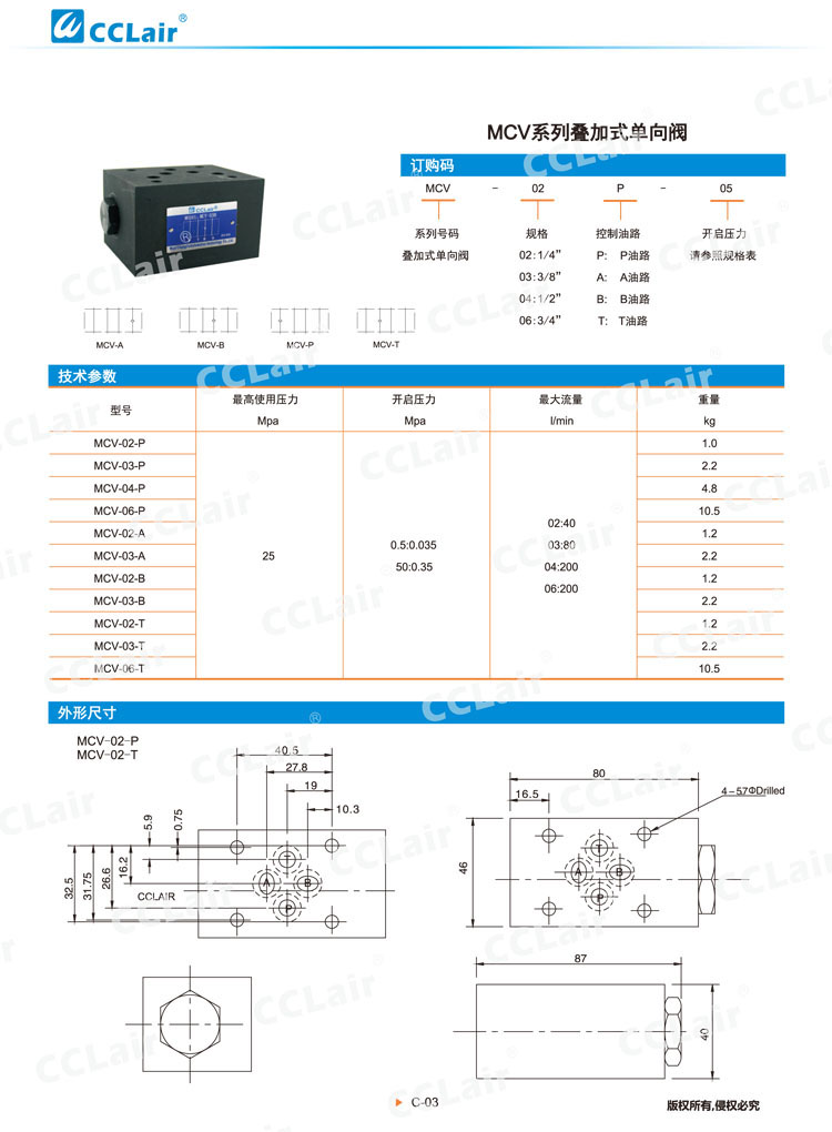 MCV-02,MCV-03,MCV-04,MCV-06,MCV-02P,MCV-03A,MCV-06T,MCV-04B,疊加式單向閥