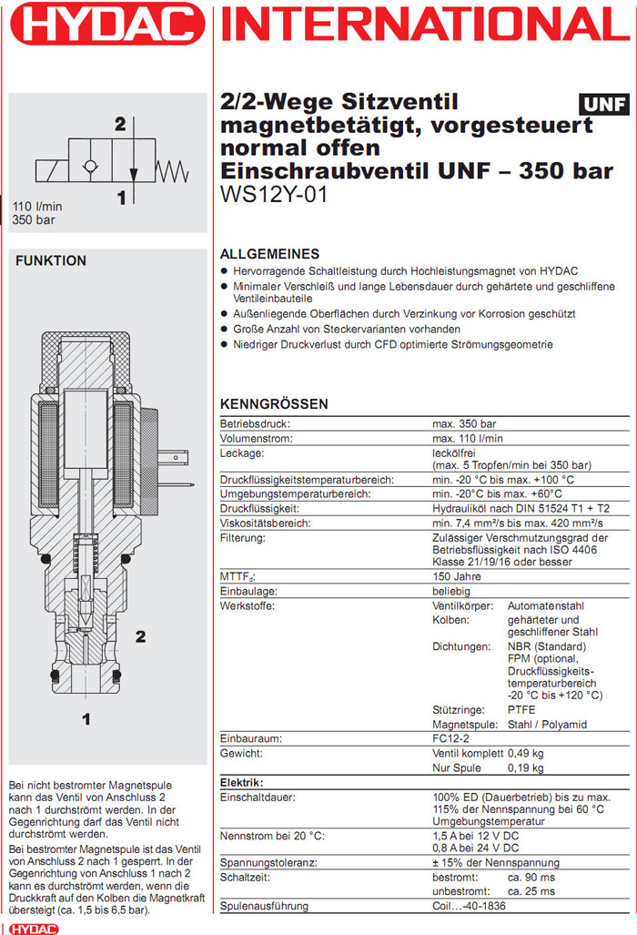 WS12Y-01-C-N-24DG,WS12Y-01-C-N-230AG,HYDAC電磁2/2方向座閥