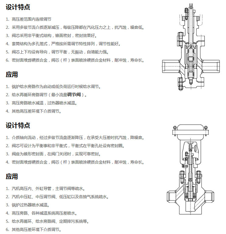 ZHD電子式電動多級調(diào)節(jié)閥采用的是多級籠式套筒閥芯或軸流迷宮型閥芯,多級減壓,完全控制流過閥內(nèi)的介質(zhì)的流速,大幅度的降低了高壓氣體或者蒸汽在閥內(nèi)產(chǎn)生的噪音,穩(wěn)定的多級別降壓有效使液體不會產(chǎn)生氣蝕,是使用在高壓介質(zhì)場所性能穩(wěn)定的控制閥,可選擇多彈簧氣動薄膜機構或電動執(zhí)行機構等。