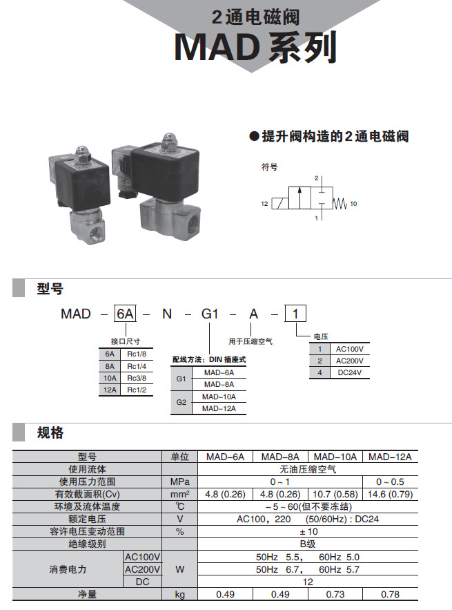 MAD-6A-N-G1-A-1,MAD-8A-N-G1-A-1,MAD-10A-N-G2-A-1,MAD-12A-N-G2-A-1,2通電磁閥