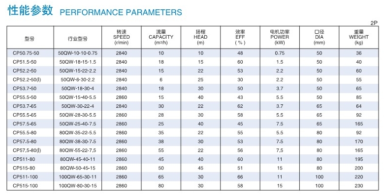 CP50.75-50,CP51.5-50,CP52.2-50,CP53.7-50,CP55.5-50,CP53.7-65,CP55.5-65,CP57.5-65,沉水式污物(泥)泵