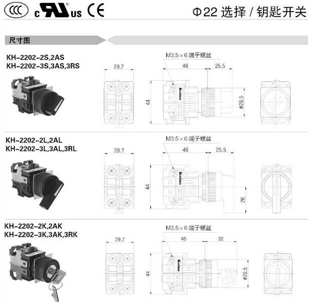 KH-2202-2S,KH-2202-2AS,KH-2202-2L,KH-2202-2AL,KH-2202-3S,KH-2202-3L,KH-2202-3RL,KoinoΦ22選擇開關(guān) |