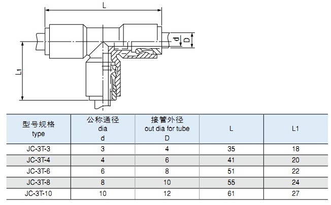 JC-3T-3,JC-3T-4,JC-3T-6,JC-3T-8,JC-3T-10,插入式三通管接頭