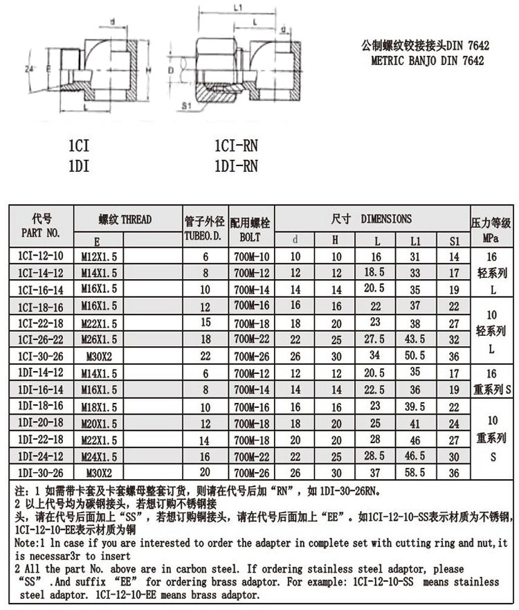 1CI-12-10,1CI-14-12,1CI-16-14,1CI-18-16,1DI-22-18,1DI-24-12,1DI-30-26,公制螺紋卡套接頭