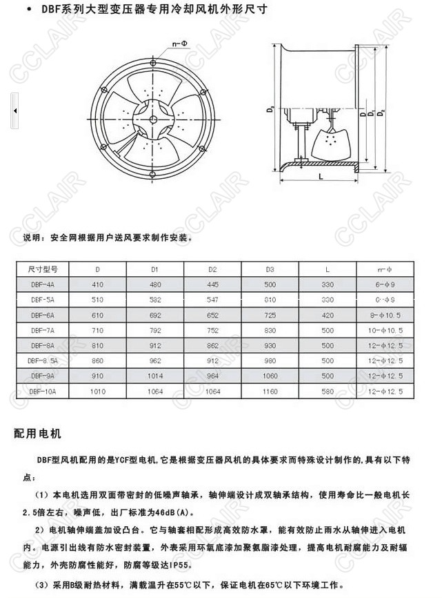 吹風(fēng)裝置配套風(fēng)扇選用的是DBF系列低噪聲變壓器風(fēng)扇,電機(jī)采用“九五”國(guó)家級(jí)科技成果推廣項(xiàng)目異步電動(dòng)機(jī)多目標(biāo)優(yōu)化設(shè)計(jì)軟件系統(tǒng)設(shè)計(jì)的專(zhuān)用電機(jī),葉輪采用低噪聲葉型,有鉚接葉輪,動(dòng)葉可調(diào)壓鑄鋁葉輪和翼形一體葉輪,采用了多項(xiàng)防護(hù)和低噪聲專(zhuān)利技術(shù),采用進(jìn)口低噪聲軸承,防護(hù)分級(jí)IP55,適用于戶外使用。,