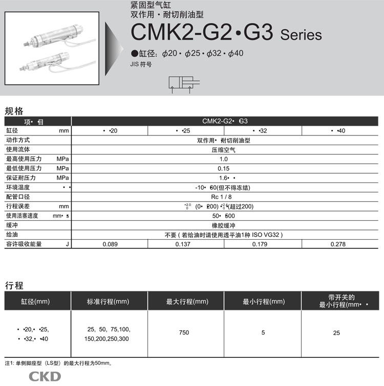 CMK2-G2-00-20-25,CMK2-G2-00-20-50,CMK2-G2-00-20-75,CMK2-G2-00-20-100,CMK2-G2-00-20-150,CKD緊固型氣缸