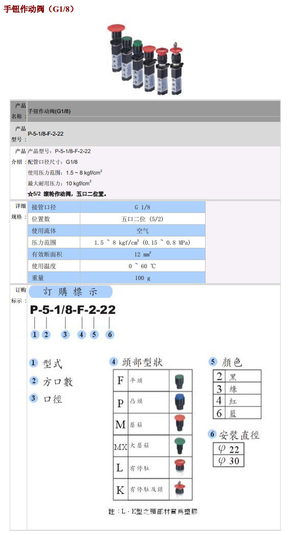 P-5-1/8-F-2-22,POSU手鈕作動(dòng)閥