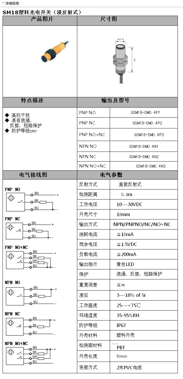 GSM18-DM0.4P1,GSM18-DM0.4P2,GSM18-DM0.4P3,GSM18-DM0.4N2,GSM18-DM0.4N3,SM18塑料光電開關(漫反射)