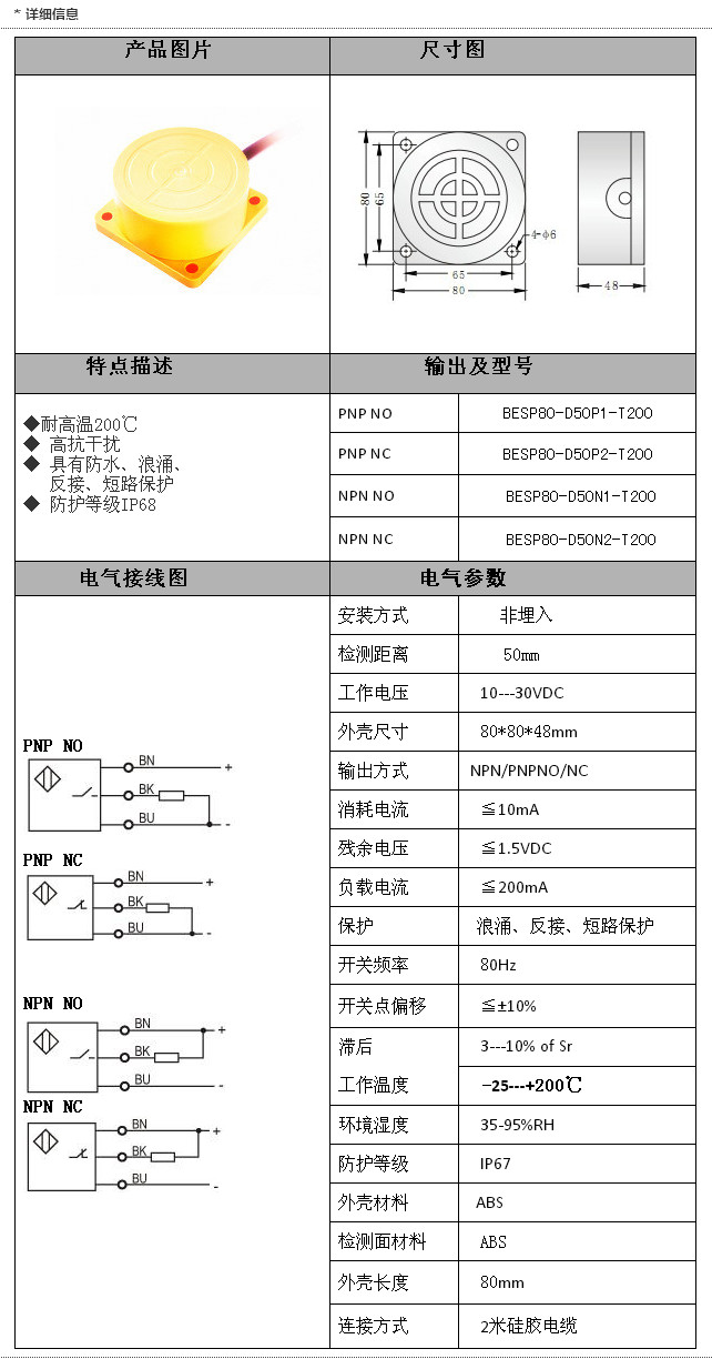 BESP80-D50P1-T200,BESP80-D50P2-T200,BESP80-D50N1-T200,BESP80-D50N2-T200,SP80耐高溫200℃接近開(kāi)關(guān)