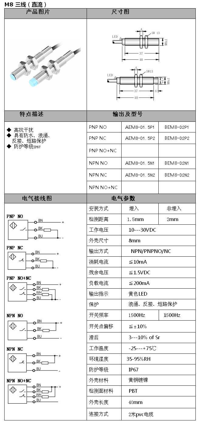 AEM8-D1.5P1,AEM8-D1.5P2,BEM8-D2P2,BEM8-D2N1,BEM8-D2N2,M8直流三二線電感式接近開關(guān)