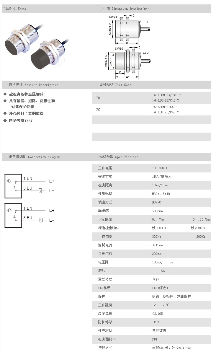 防水/防油/防腐蝕接近開關(guān) HG-L30M-ZK/C40-T,HG-L30-ZK/C40-T,HG-L30M-ZBC40-T,HG-L30-ZB/C40-T,
