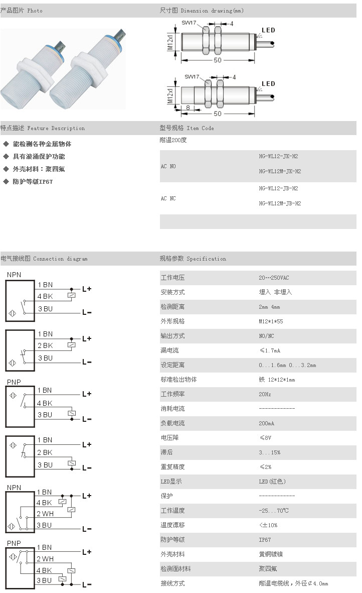 耐高溫接近開(kāi)關(guān)(低溫) HG-WL12-JK-H2,HG-WL12M-JK-H2,HG-WL12-JB-H2,HG-WL12M-JB-H2,