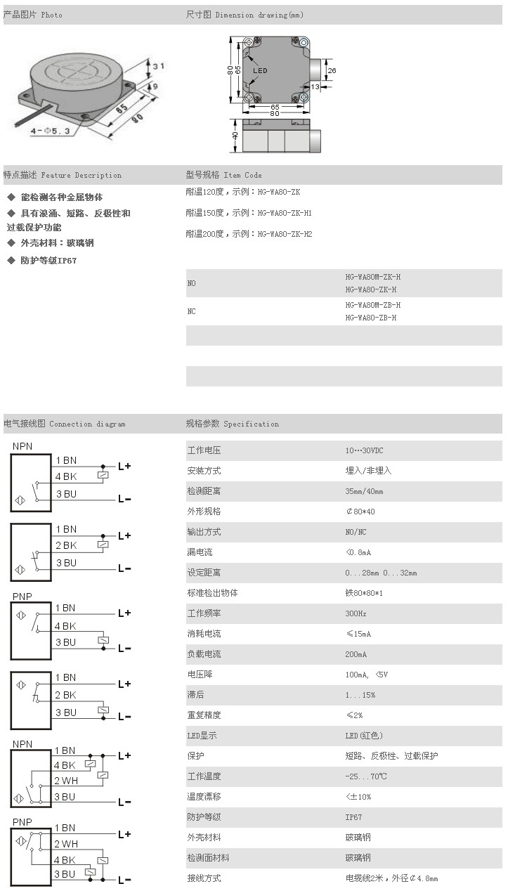 耐高溫接近開關(低溫) HG-WA80M-ZK-H,HG-WA80-ZK-H,HG-WA80M-ZB-H,HG-WA80-ZB-H,