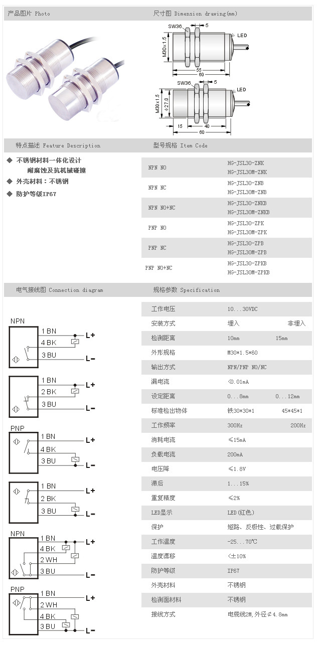 金屬探頭型接近開關(guān) HG-JSL30-ZNK,HG-JSL30M-ZNK,HG-JSL30-ZNB,HG-JSL30M-ZNB,