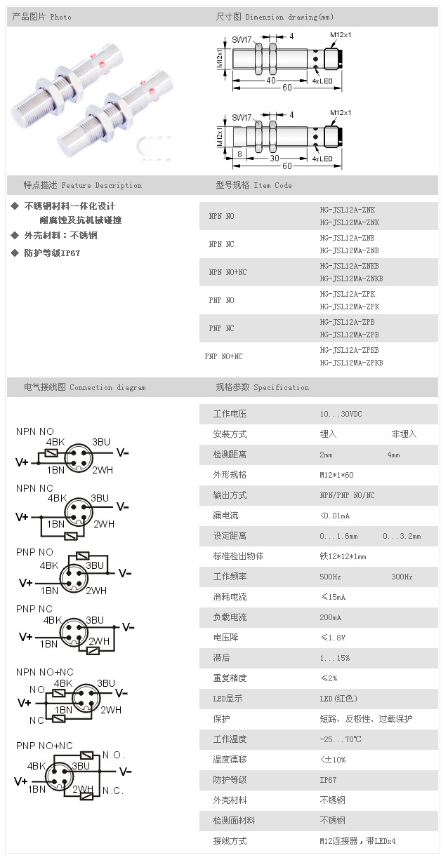 金屬探頭型接近開關(guān) HG-JSL12A-ZNK,HG-JSL12MA-ZNK,HG-JSL12A-ZNB,HG-JSL12MA-ZNB,