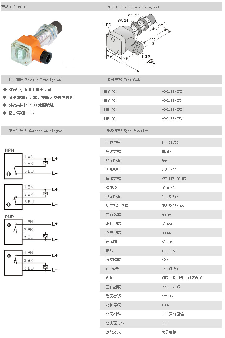 圓柱型接近開關(guān) HG-L18Z-ZNK,HG-L18Z-ZNB,HG-L18Z-ZPK,HG-L18Z-ZPB,