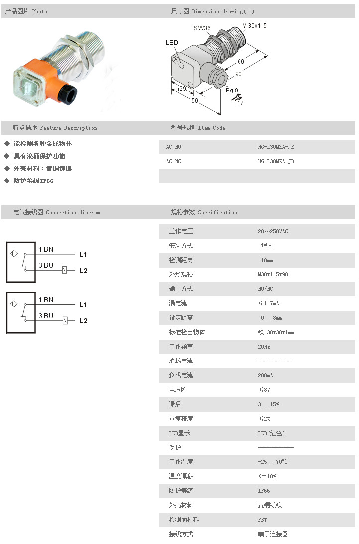 L30MZA圓柱型接近開關(guān) HG-L30MZA-JK,HG-L30MZA-JB,