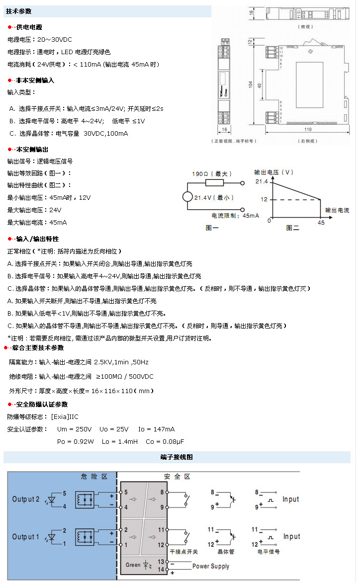 該安全柵采用獨(dú)立的直流24V電源供電,供電電源-輸入-輸出之間全隔離。