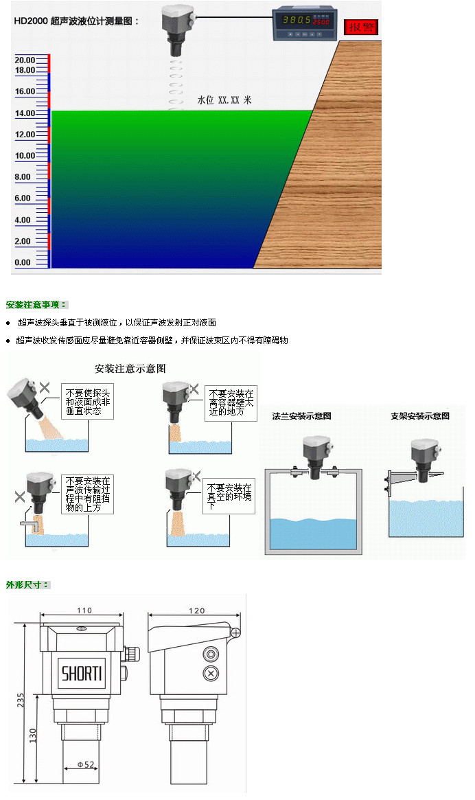 概述:HD2000超聲波液位計(jì)是一種先進(jìn)的非接觸式物位測(cè)量?jī)x器,用來(lái)取代原始的各種液位計(jì),直接安裝在被測(cè)介質(zhì)的上方。它采用一體式進(jìn)口超聲波傳感器,通過(guò)測(cè)量時(shí)間差的原理,經(jīng)微處理器進(jìn)行信號(hào)處理精密計(jì)算,測(cè)得液位/料位高低。帶自動(dòng)溫度補(bǔ)償、假信號(hào)回避功能,自動(dòng)增益控制,新型高防護(hù)外殼,智能液晶顯示并輸出標(biāo)準(zhǔn)信號(hào)4~20mA 或RS485、 上下限報(bào)警。