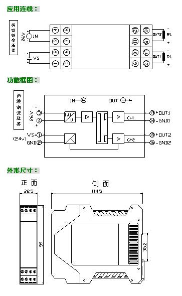 l 將1路4-20mA信號隔離分為2路信號輸出,并對現(xiàn)場二線制變