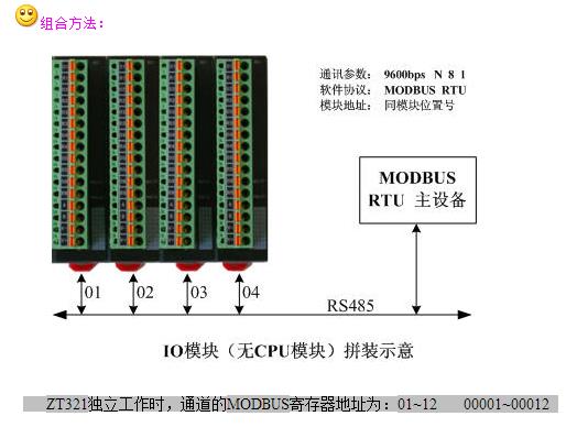 ZT321自帶一個RS485通訊口,內(nèi)部封裝了MODBUS協(xié)議,可以獨立工作,MODBUS從站地址等于從左向右排列的位置號。