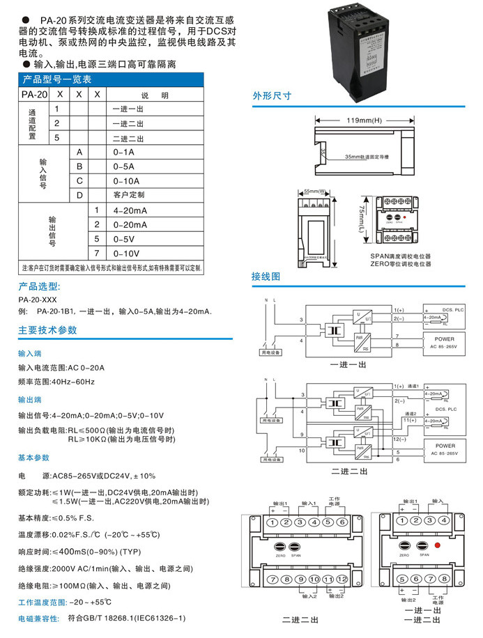 PA-20-1A1,PA-20-1A5,PA-20-2A7,PA-20-2B1,PA-20-5D5,PA-20-5D7,PA-20,交流電流變送器
