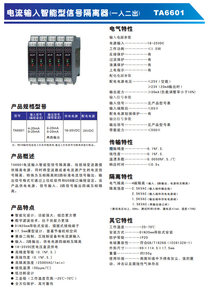 TA6601,電流輸入智能型信號(hào)隔離器(一入二出)