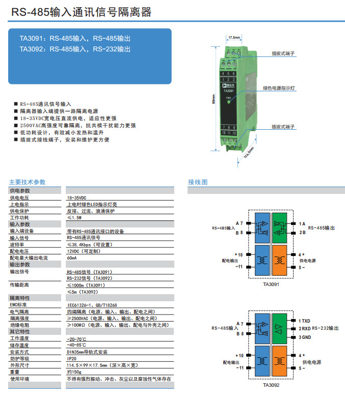 TA3091,TA3092,RS-485輸入通訊信號隔離器