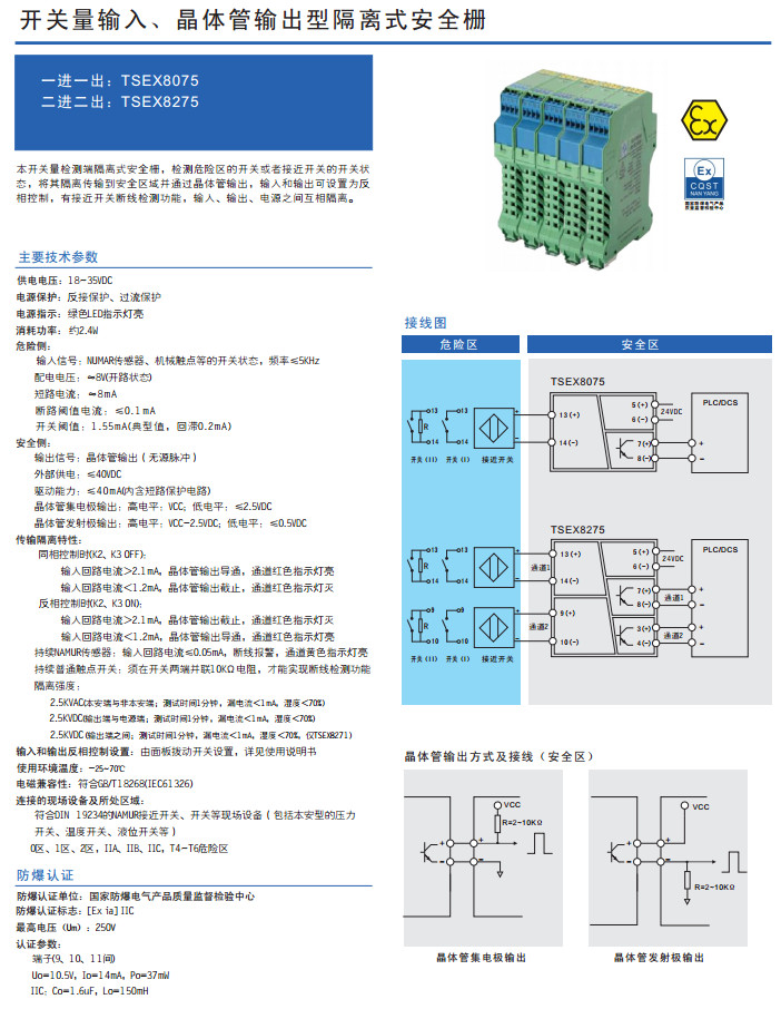 TSEX8075,TSEX8275,開關(guān)量輸入、晶體管輸出型隔離式安全柵