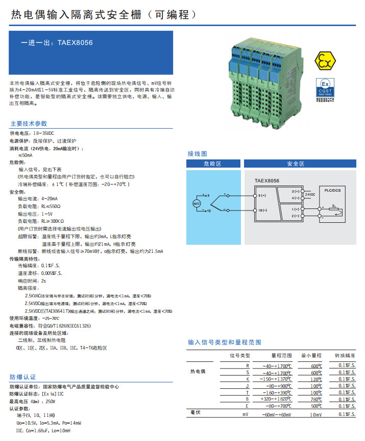 TAEX8056,熱電偶輸入隔離式安全柵(可編程)