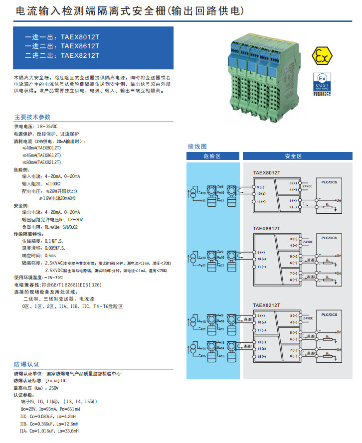 TAEX8012T,TAEX8612T,TAEX8212T,電流輸入檢測端隔離式安全柵