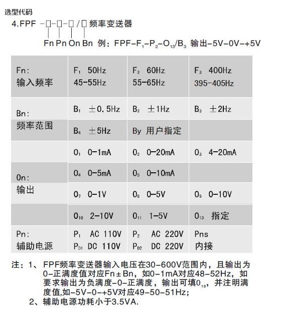 描述:此型號(hào)為頻率變送器,45~55Hz工頻頻率信號(hào)輸入,輸出4~20mAdc, 工作電源AC220V