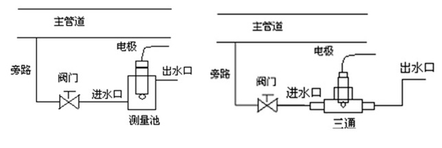 為保證電極在管路上正確測量出pH值,應(yīng)避免測量池間出現(xiàn)氣泡而造成數(shù)據(jù)失準(zhǔn),請嚴(yán)格按下圖安裝