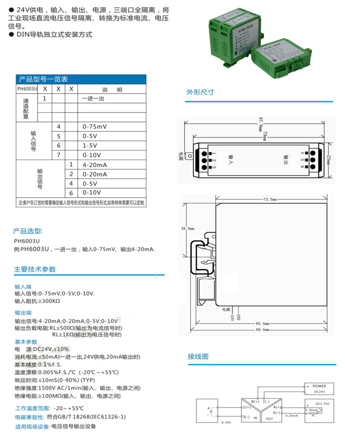 PH6003U141,PH6003U142,PH6003U154,PH6003U162,PH6003U176,PH6003U,電壓輸入隔離器(有源型)