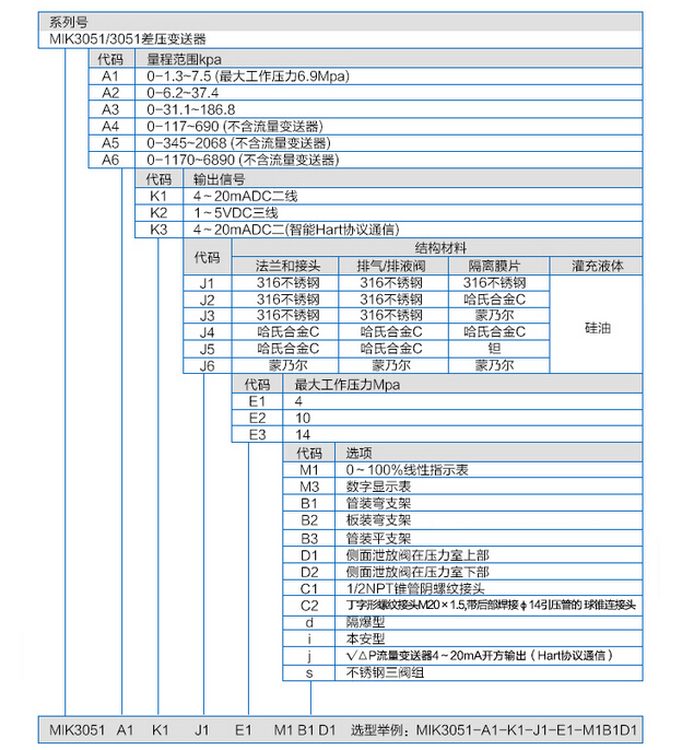 例如:MIK3051-A1(0.6)-K1-J1-E1-M1B1D1 表示