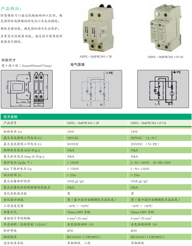 NPFL-3MPW385×P+N,NPFL-3MPW385×2P,單相交流電源系統(tǒng)浪涌保護(hù)器(20KA)
