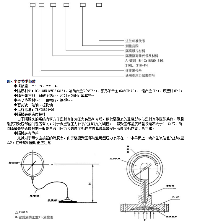 結構原理 隔膜壓力表由各種通用型壓力儀表和不同結構的隔膜隔離器組成一個封閉系統(tǒng),內充密封液。當被測介質的壓力作用于隔膜時,則隔膜產生變形,壓縮封閉系統(tǒng)中的密封液。由于密封液的固有性質,使壓力儀表中的彈性元件產生相應的彈性變形一位移,經指示裝置顯示壓力值。當隔膜的剛度足夠小時,則壓力儀表指示的壓力就近于被測介質的壓力值。